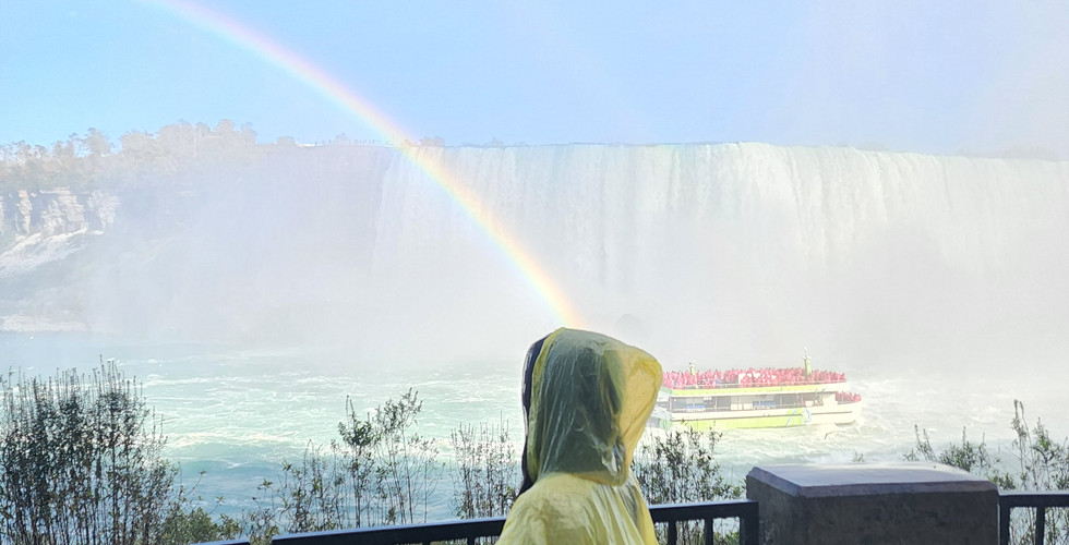 If boats aren’t your cup of tea or you’re prone to seasickness very, journeying behind the falls is another great way to witness the falls from a unique perspective. We descended 125 ft by an elevator and were greeted with a long dark tunnel. We were all handed rain ponchos on our way in which was a definite necessity! Behind the falls, we could see fresh water crashing down at a staggering speed of 65 kilometres an hour! The upper and lower observation decks were super cool as it allowed us to step out and stand right beside the falls, offering an unparalleled experience! Not only was it an eye-opening experience to witness the falls up close, there was tons of history and pictures plastered on the walls of the tunnel.
